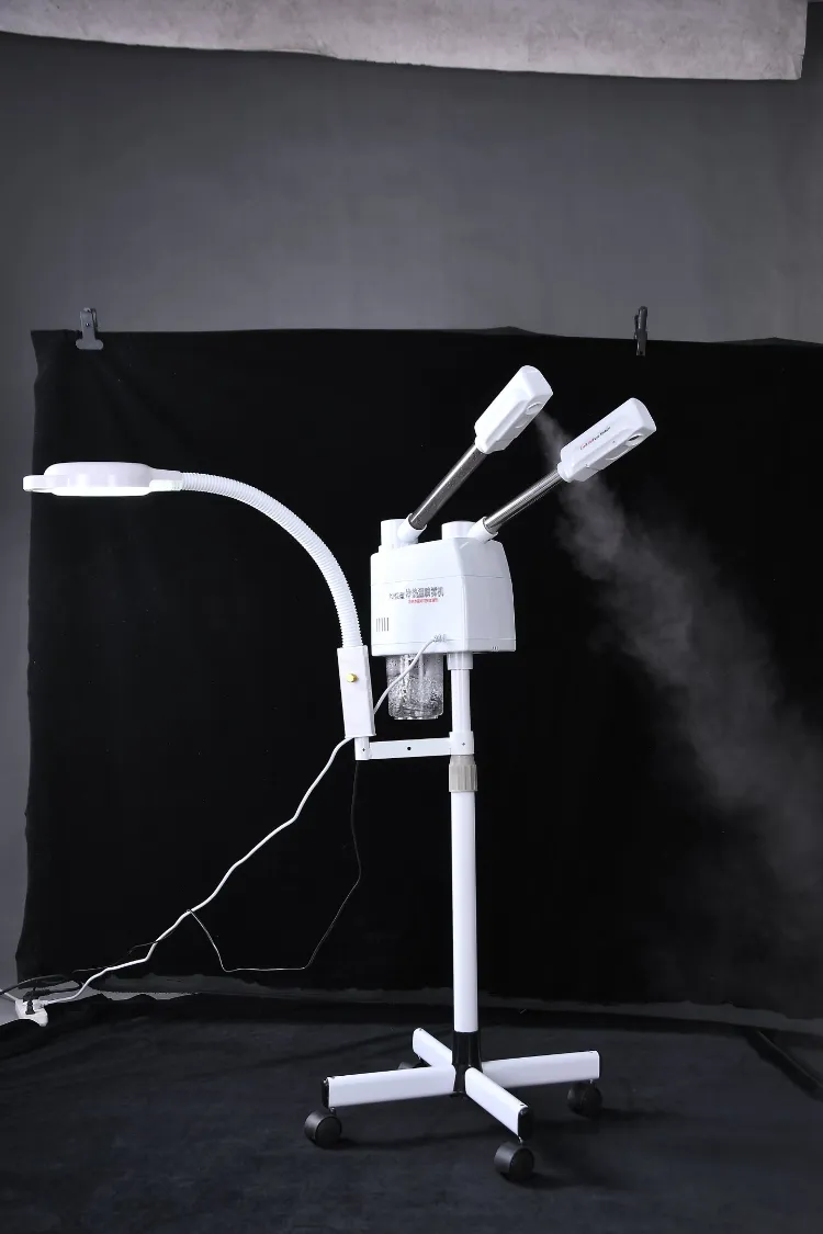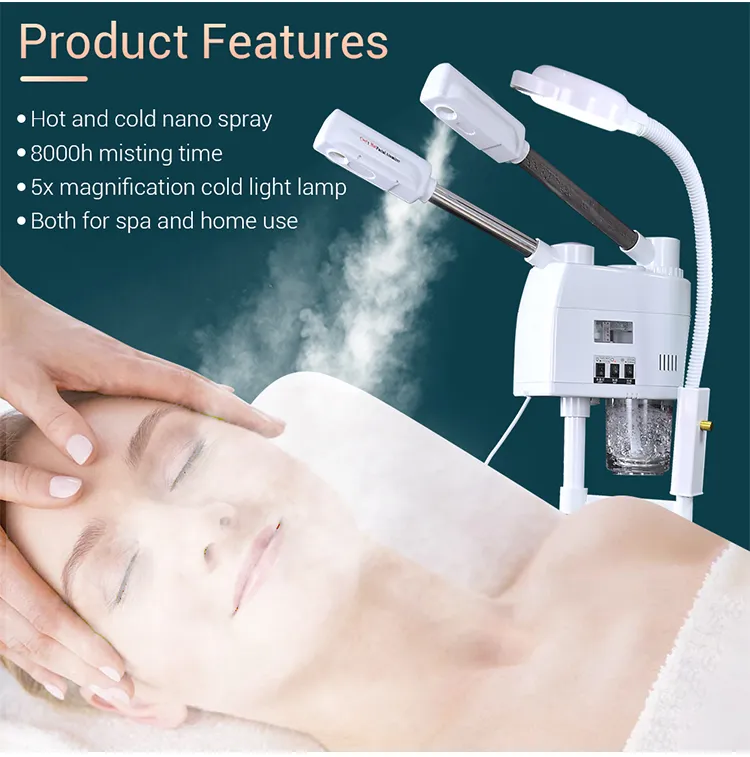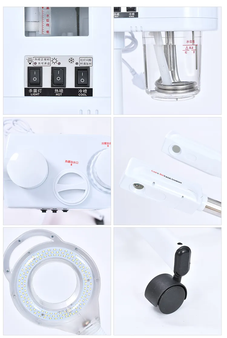This facial steamer device has a separate cold and hot water tank, achieving both hot and cold spray. The hot steam helps to open up the pores, promoting blood circulation and relaxing facial muscles. The cold mist helps to shrink pores, soothe the skin, and reduce redness. Equipped with a cold light magnifying lamp for professional skin analysis.